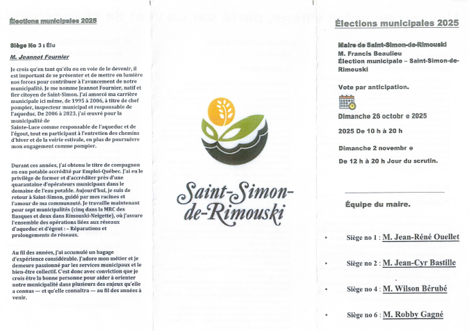 (Alexandre D’Astous)-La municipalité de Saint-Simon-de-Rimouski rappelle aux candidats aux élections municipales qu’il est interdit d’utiliser le logo de la municipalité sur leurs outils promotionnels dans le cadre de la présente campagne électorale.