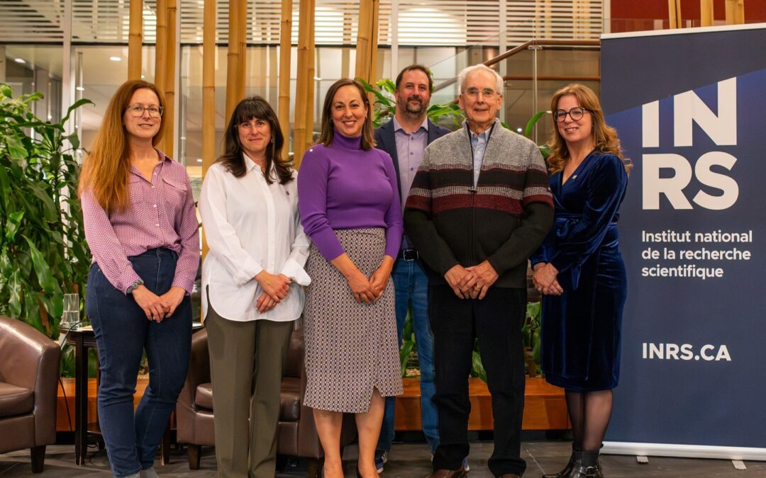 Photo : de gauche à droite : Myrian Grondin – Responsable de la bibliothèque du Centre Urbanisation Culture Société de l’INRS, Gabrielle Leblanc – Coordonnatrice du projet d’implantation Centre Ruralités durables, Isabelle Delisle – Directrice scientifique de l’INRS, David Tremblay – Chercheur associé au Centre Ruralités durables, Bernard Vachon – Professeur retraité de l’UQAM, référence au Québec en études rurales et Amélie Forget – Directrice d’implantation du Centre Ruralités durables. Crédit photo Nadine Tremblay