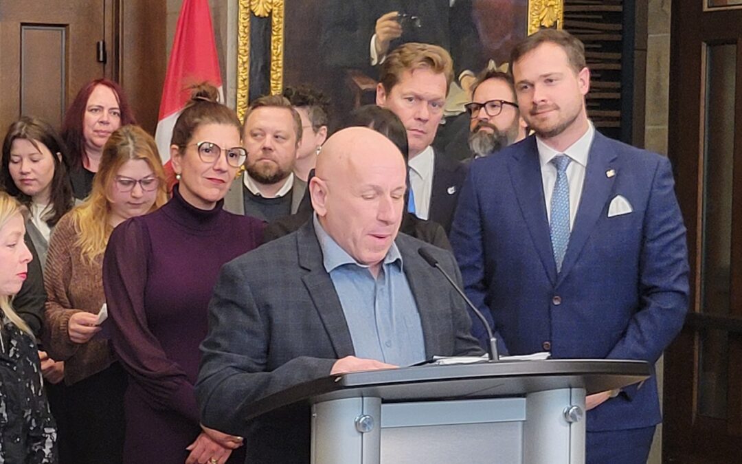 Photo : Maxime Blanchette-Joncas lors du point de presse du Bloc Québécois et de l’Alliance interprovinciale de l’assurance-emploi sur le trou noir de l’assurance-emploi. (Photo courtoisie)