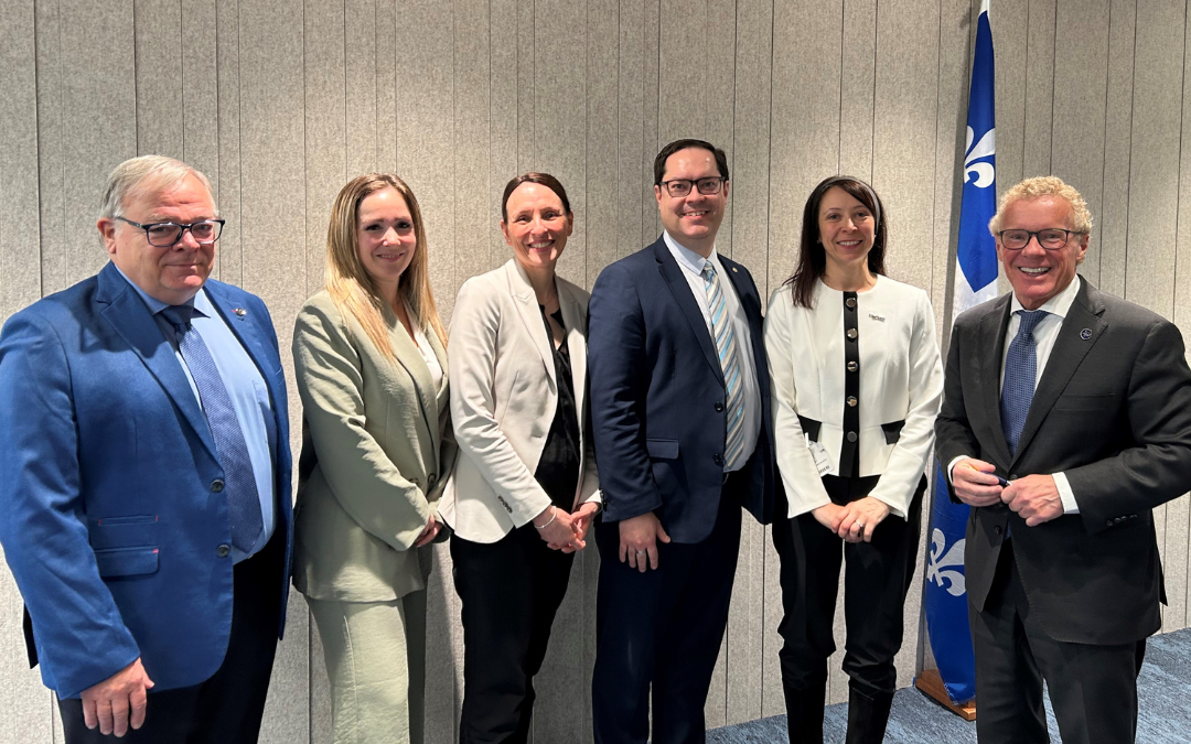 Photo : L’Ordre des chimistes du Québec était présent le 25 mars dernier à l’occasion de l’étude détaillée du projet de loi 15. De gauche à droite : Luc Provençal, député de Beauce-Nord et président de la Commission de la santé et des services sociaux, Carole Mallette, députée de Huntingdon et adjointe parlementaire du ministre du Travail, Gorette Linhares, cheffe de bureau, des communications et des affaires publiques à l’Ordre, Patrick D. Paquette, directeur général et secrétaire de l’Ordre, Mélanie Hillinger, présidente de l’Office des professions du Québec et Jean Boulet, ministre de l’Économie, de l’Innovation, de l’Énergie et du Travail, ministre responsable de l’application des lois professionnelles. (Crédit courtoisie.)