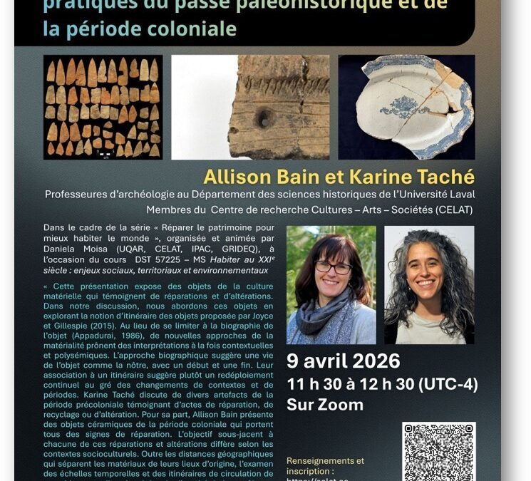 (Alexandre D’Astous)-Le Groupe de recherche interdisciplinaire sur le développement régional de l’Est du Québec (GRIDEQ), en collaboration avec le Centre de recherche Cultures – Arts – Sociétés (CELAT) et l’Institut du patrimoine culturel (IPAC), propose une conférence d’Allison Bain (Université Laval) et de Karine Taché (Université Laval), intitulée : Témoins archéologiques de réparations : pratiques du passé paléohistorique et de la période coloniale, le jeudi 9 avril de 11 h 30 à 12 h 30 à la salle E-305 (campus de Rimouski de l’UQAR) ou par Zoom.