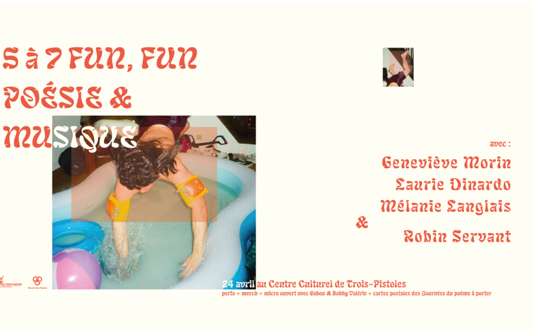 Dans le cadre de la semaine du Poème à porter, un projet de La poésie partout, plusieurs activités sont organisées au Québec, en plus d’une grande distribution de cartes postales poétiques. Le 5 à 7 fun, fun, poésie & musique de Trois-Pistoles s’inscrit dans cette programmation.